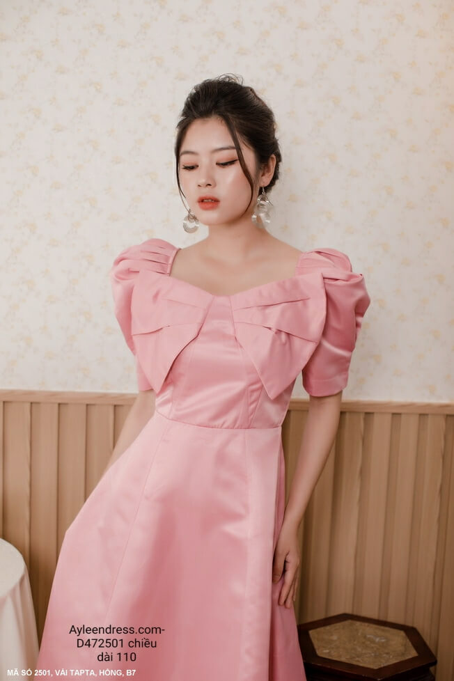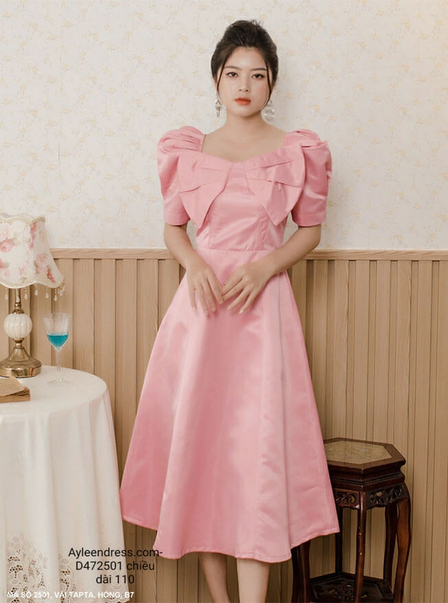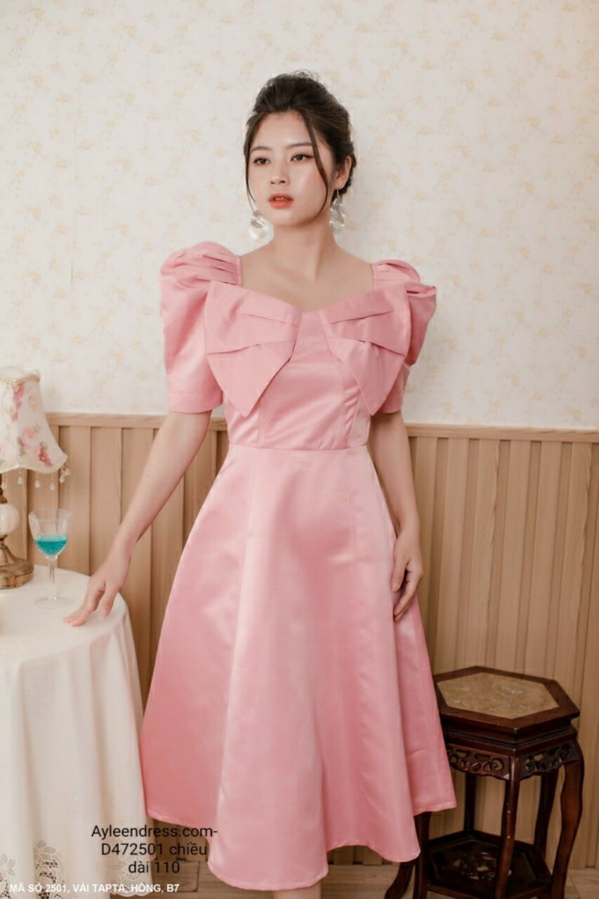 Đầm xòe tay ngắn phồng nơ lớn trước ngực sang trọng