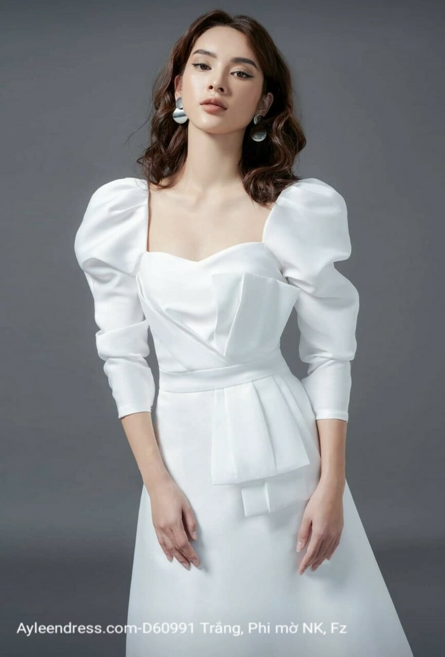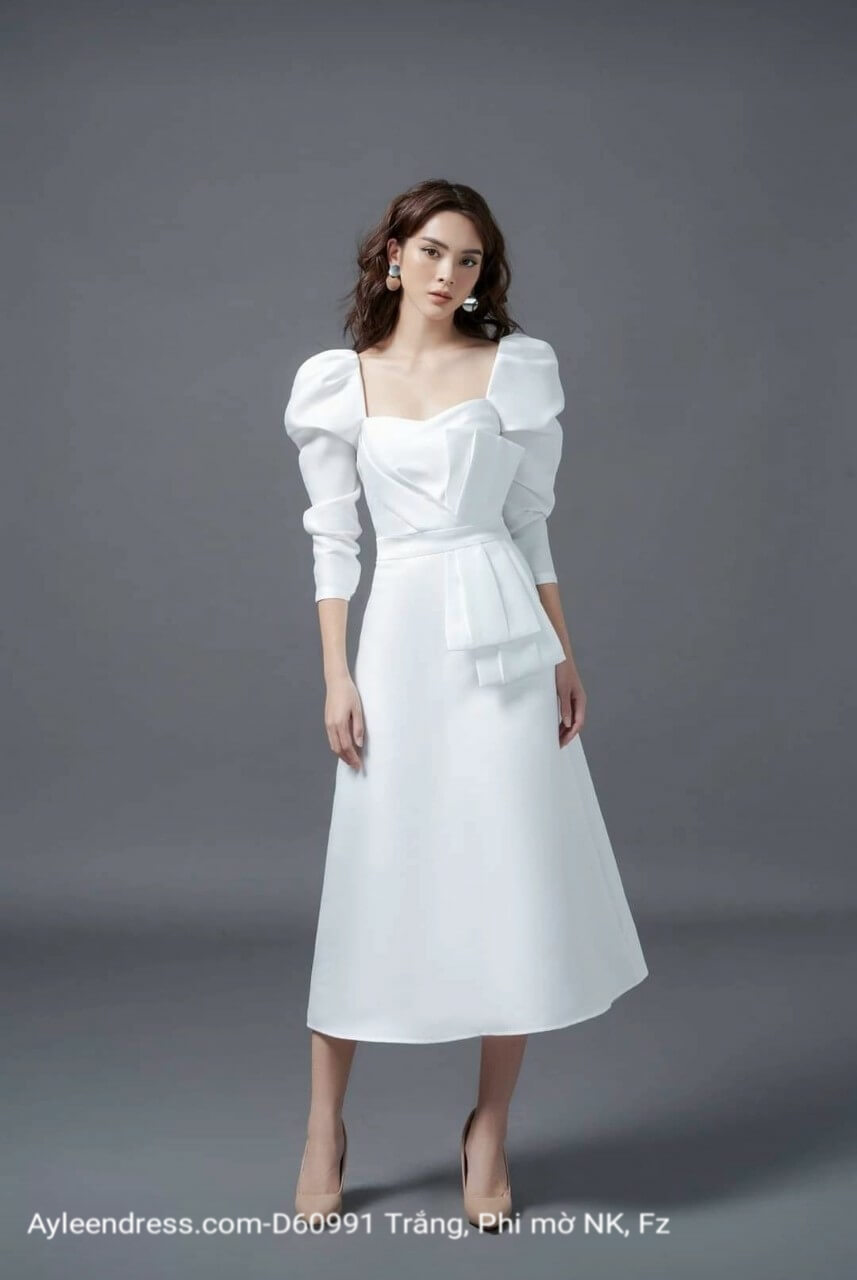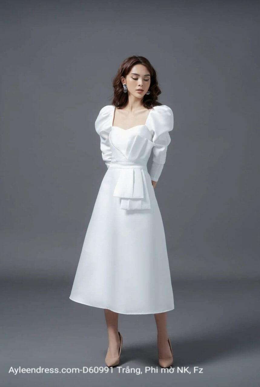 Đầm xòe trắng tay phồng dài cúp ngực phối nơ