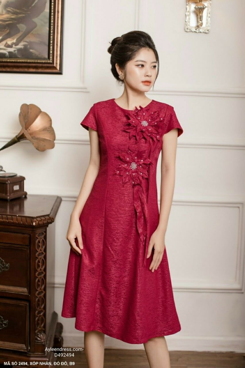 Đầm xòe trung niên kết 2 hoa trước ngực
