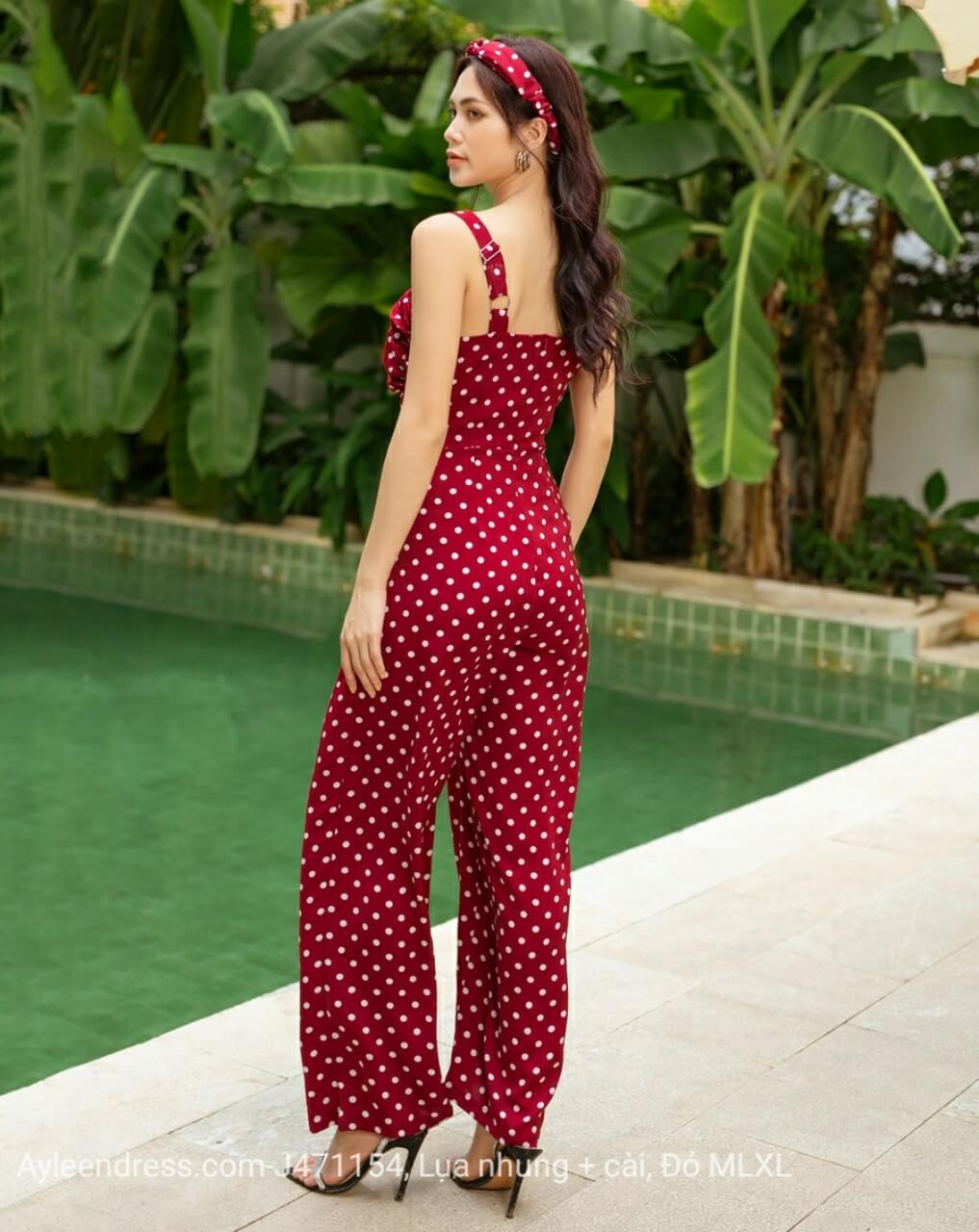 Jumpsuit dài 2 dây xoắn ngực đỏ chấm bi (tặng kèm băng đô)