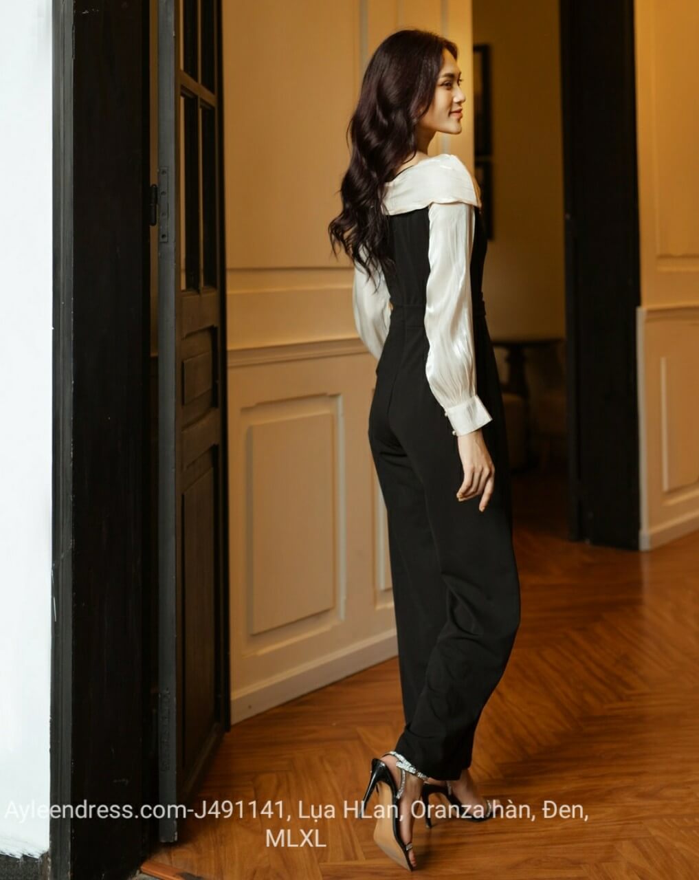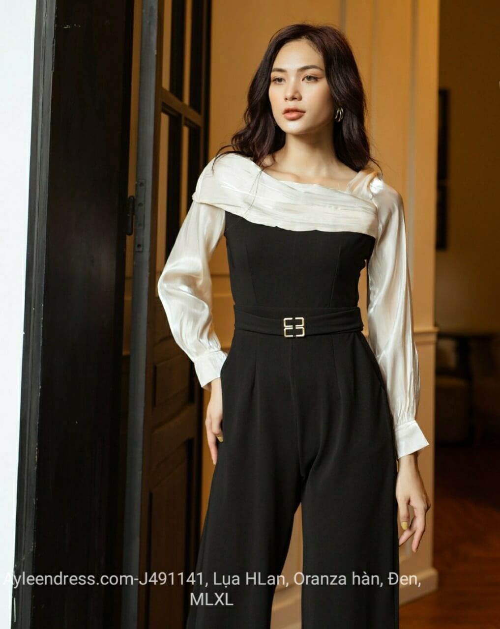 Jumpsuit dài lệch vai phối trắng phối eo