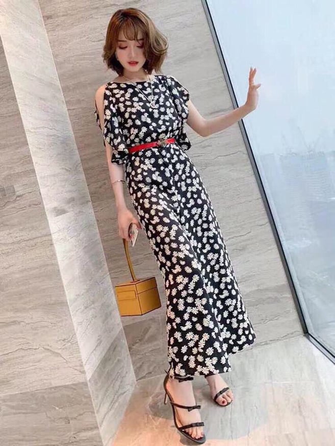 Jumpsuit hoa dài cúc họa mi tay xẻ