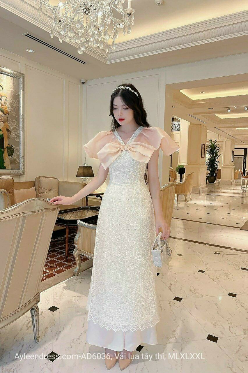 Set áo dài ren 4 tà cổ cách điệu thời trang tà viền ren