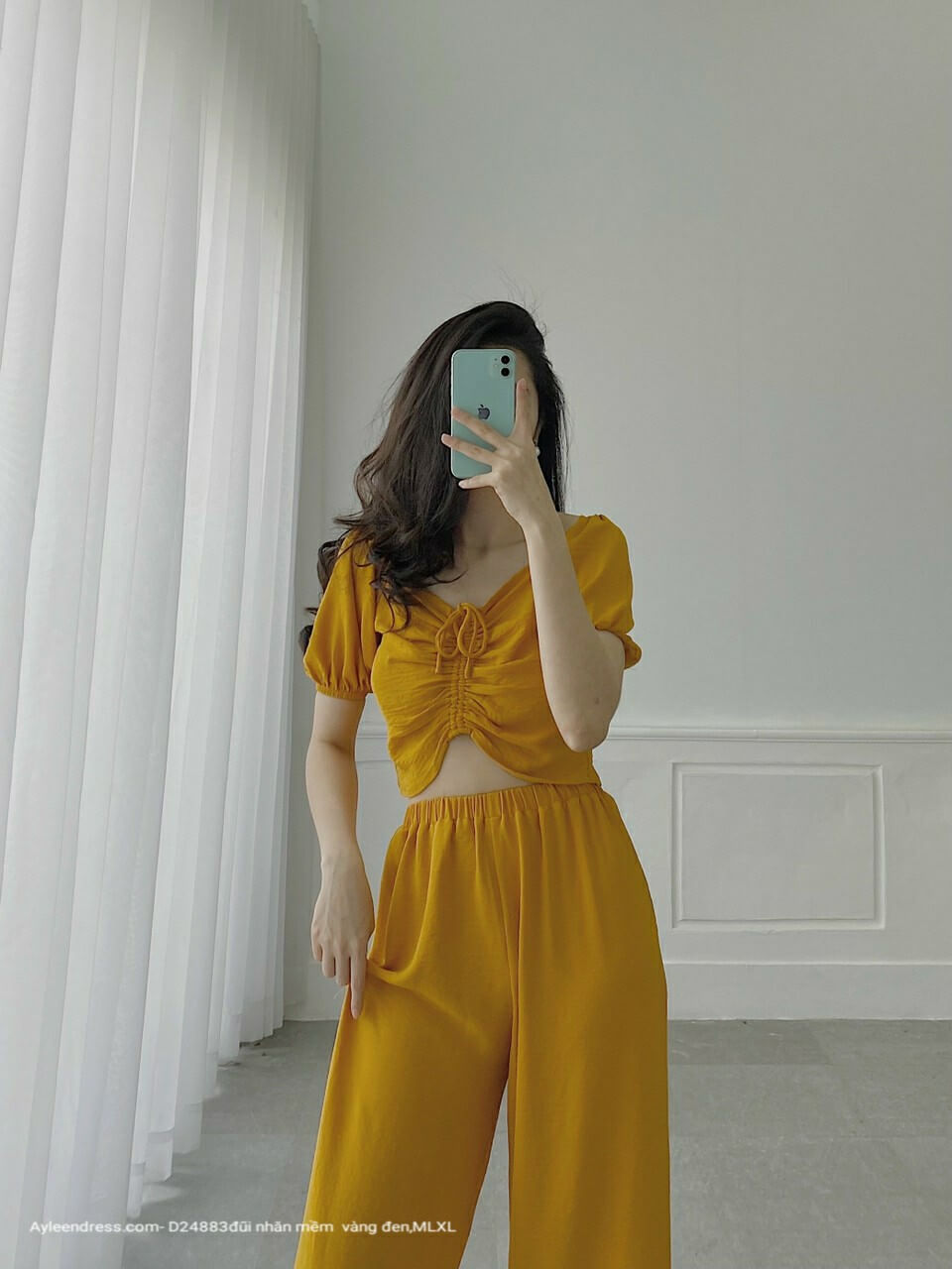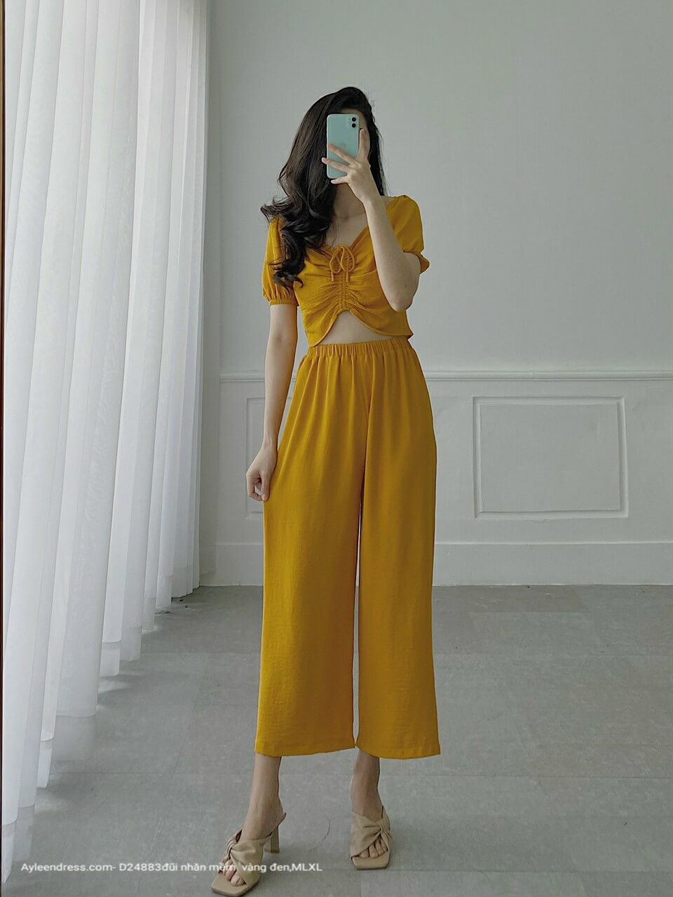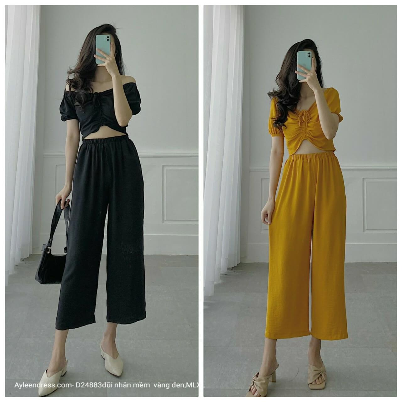 Set áo dây rút quần ống rộng mặc nhà
