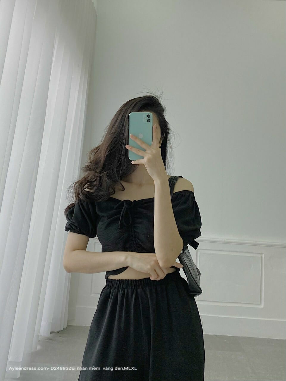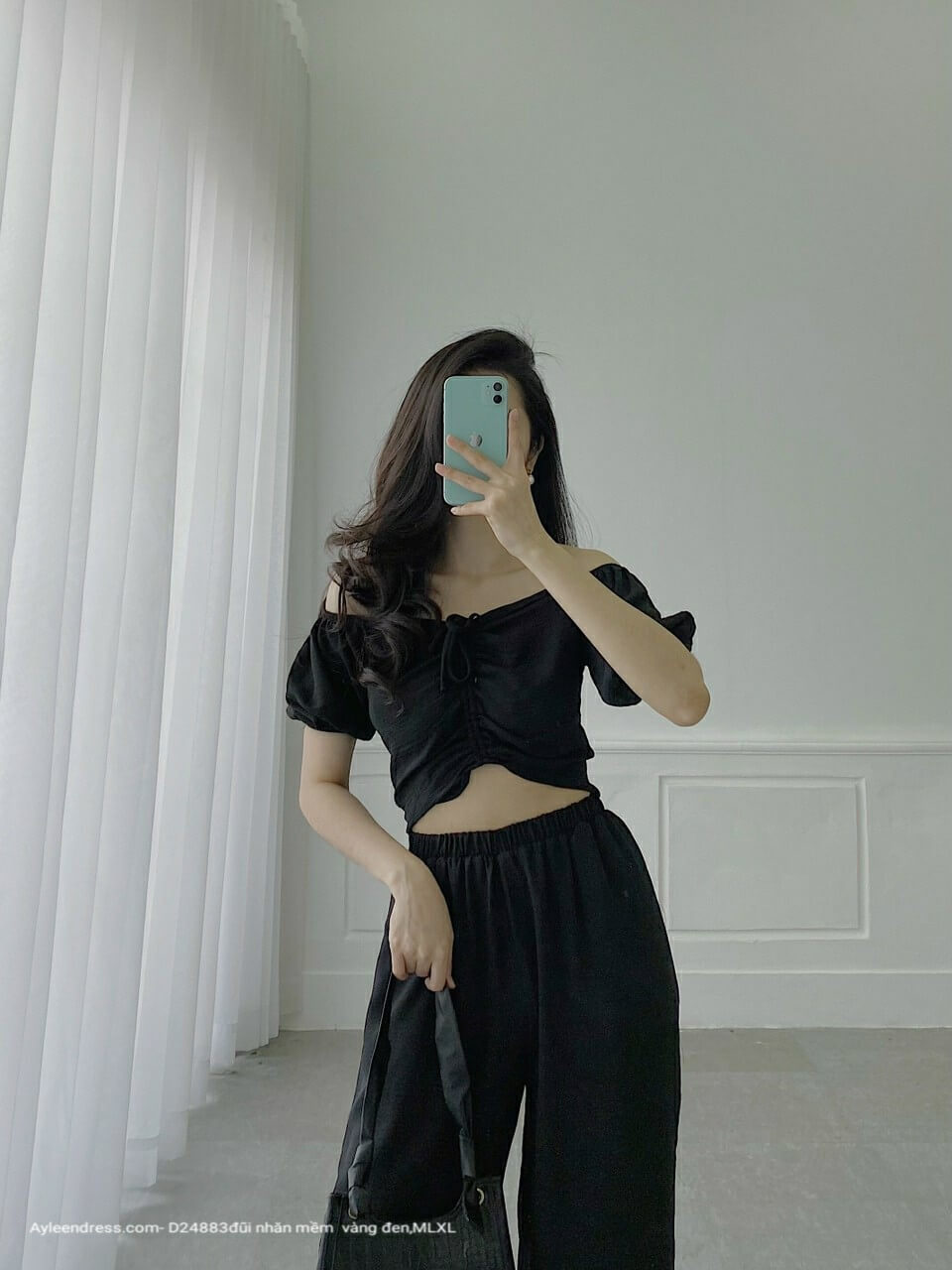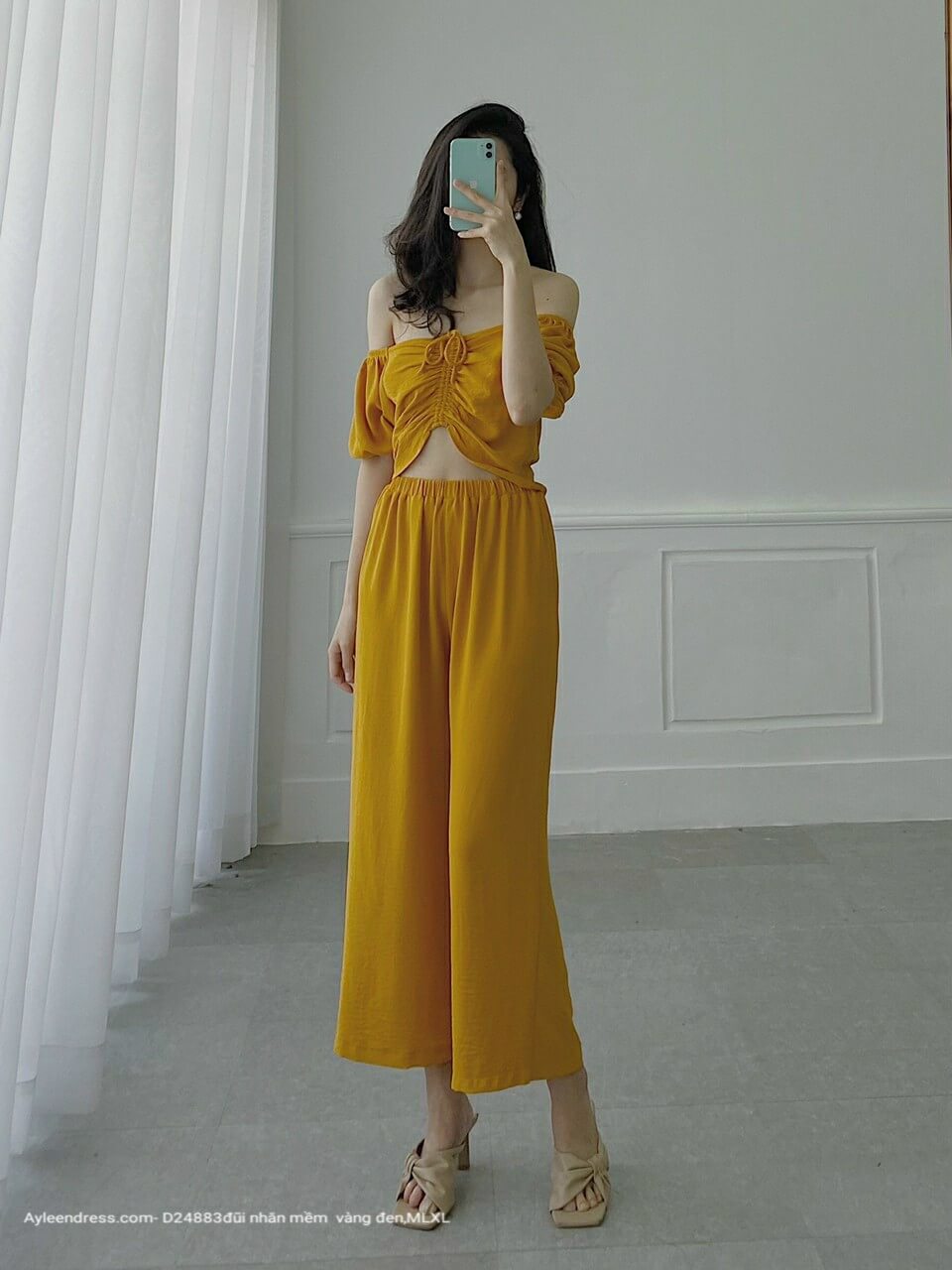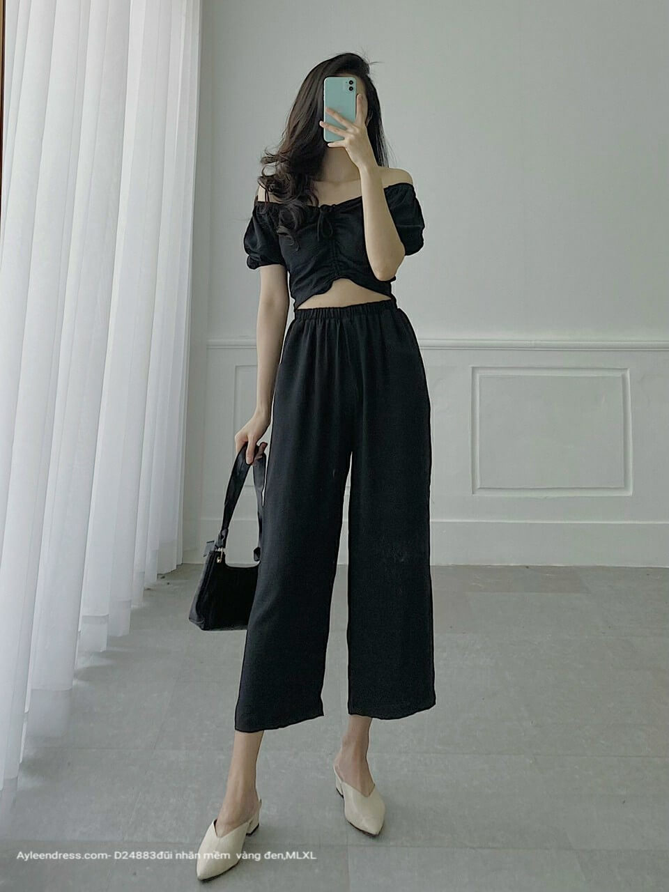 Set áo dây rút quần ống rộng mặc nhà