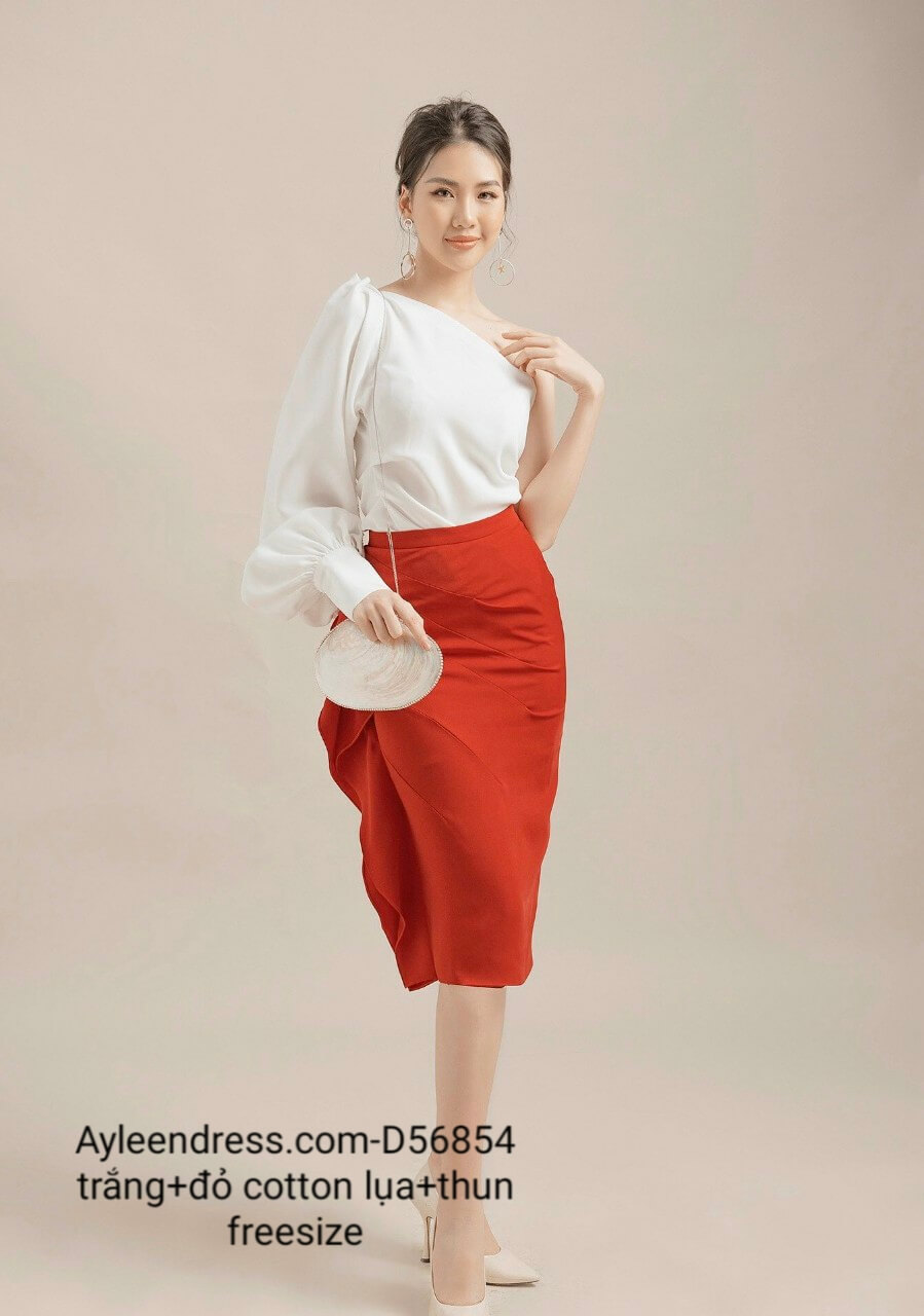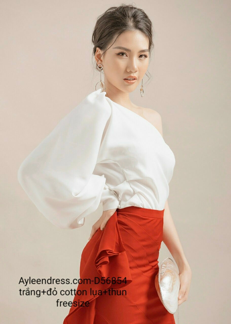 Set áo váy kiểu áo tay dài lệch vai vay bèo
