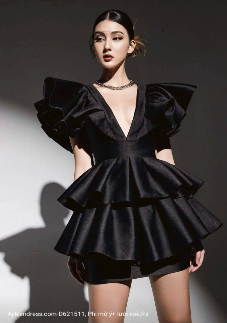 Set áo váy màu đen kiểu áo xòe tầng xẻ ngực phối váy ôm ngắn