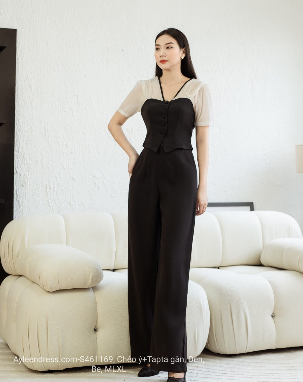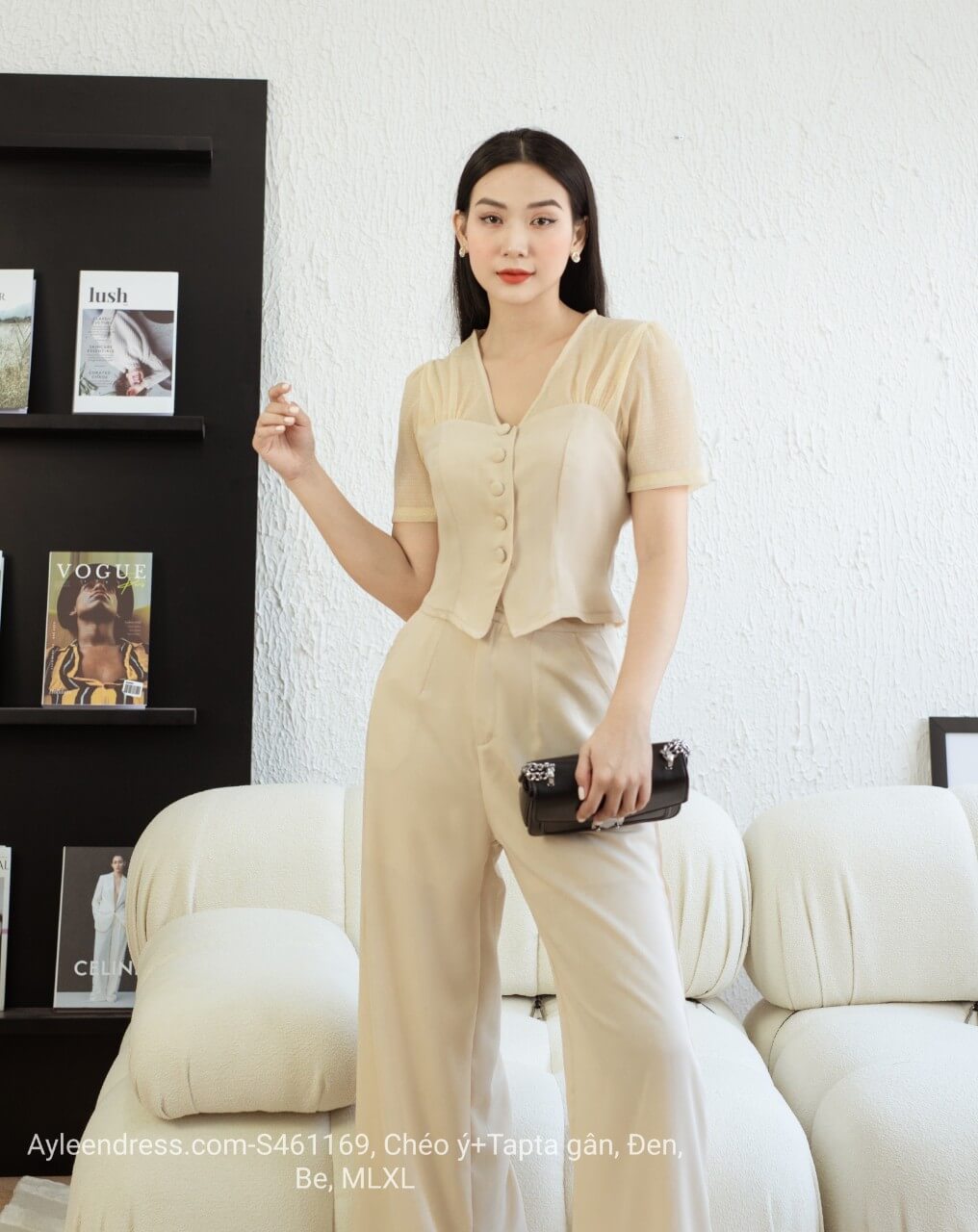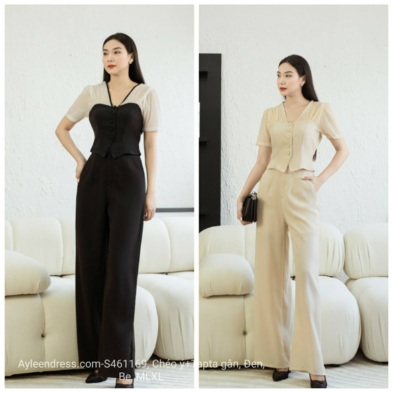 Kiểu dáng : Thiết kế áo kiểu tay con cổ V cài nút, quần lưng cao ống rộng tôn dáng