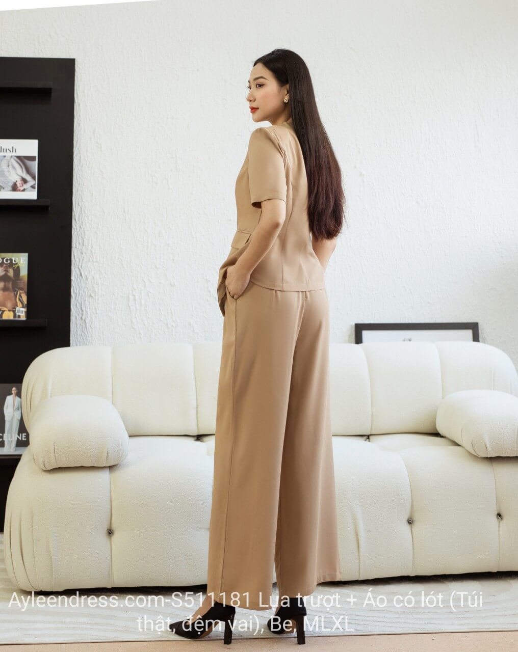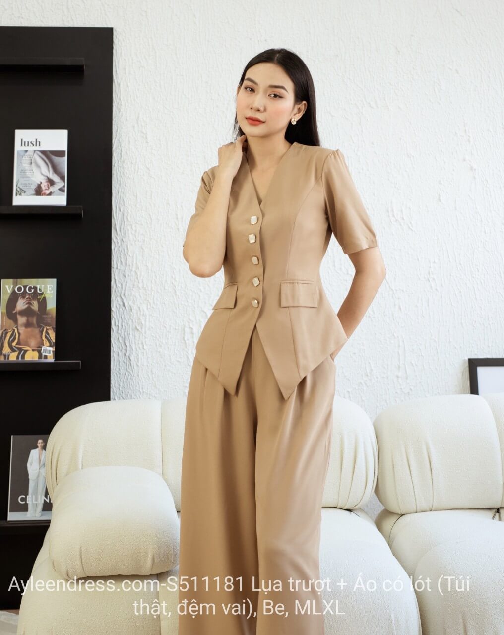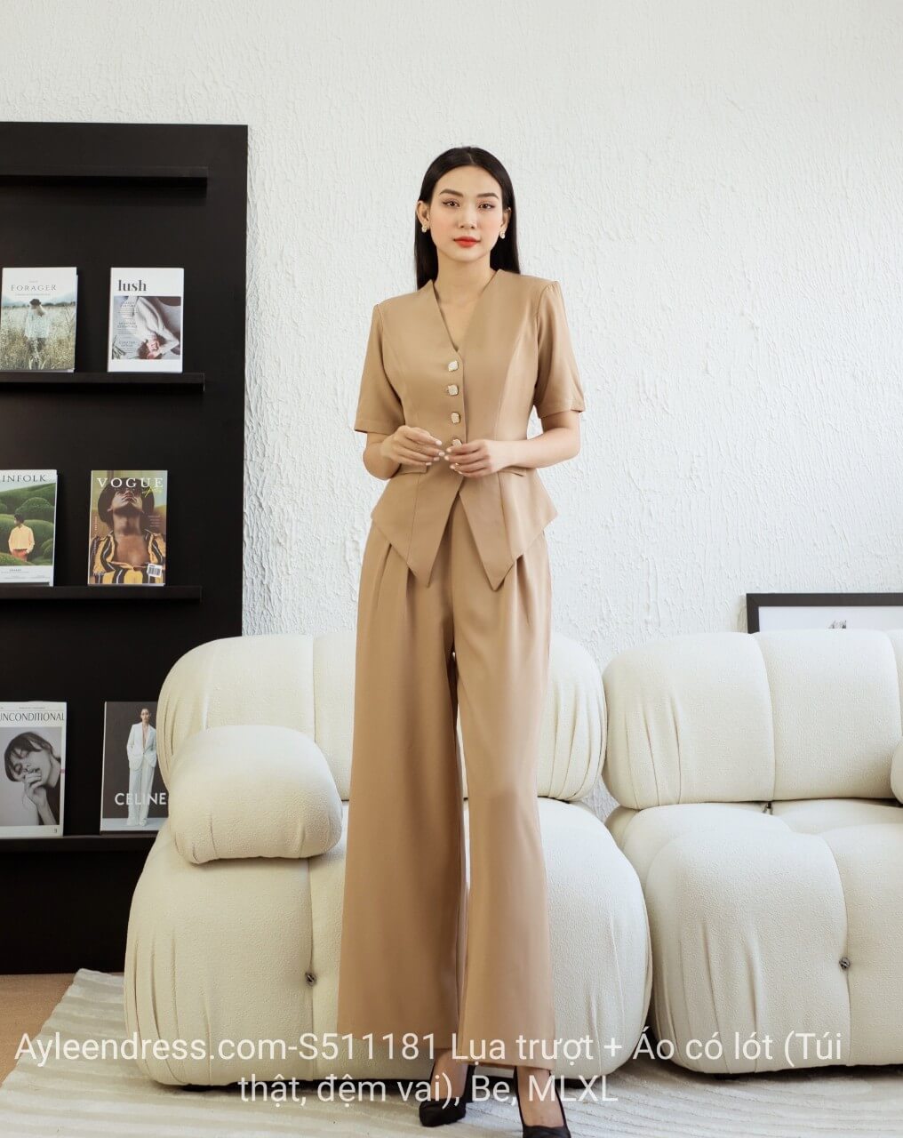 Kiểu dáng : Thiết kế áo kiểu vest 2 lớp tay con, quần ống rộng sang trọng