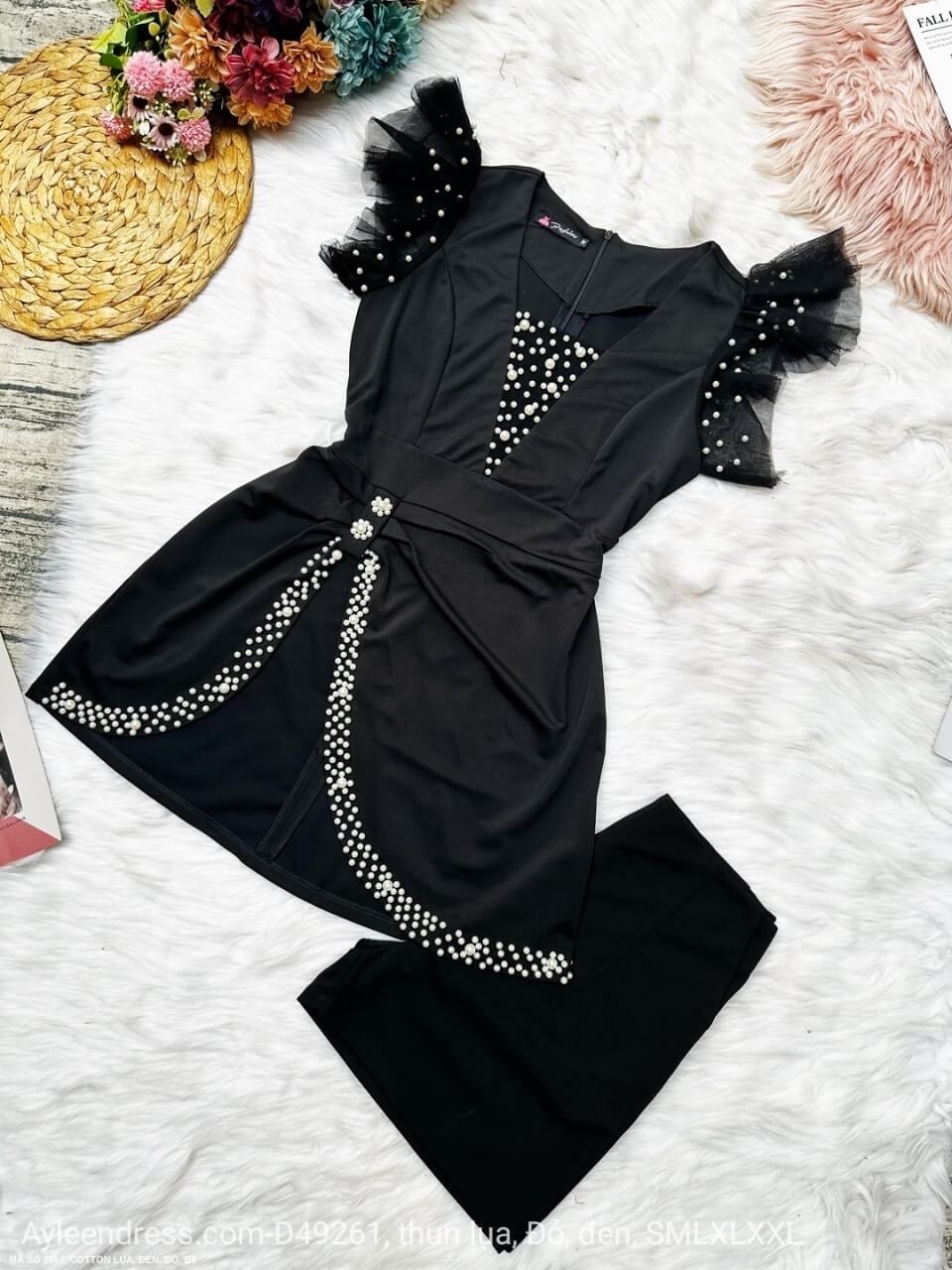 Bộ quần áo tay lưới đính hạt lai áo và cổ áo