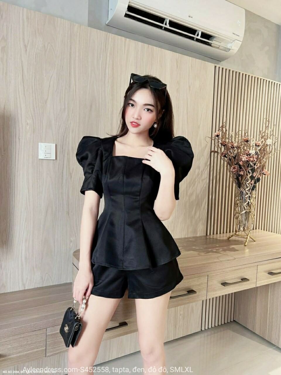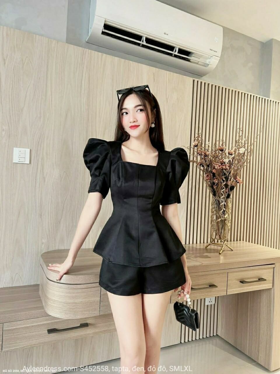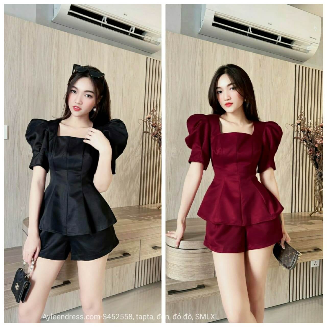 Set bộ đùi cổ vuông tay phồng áo peplum