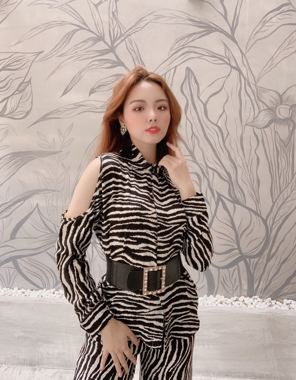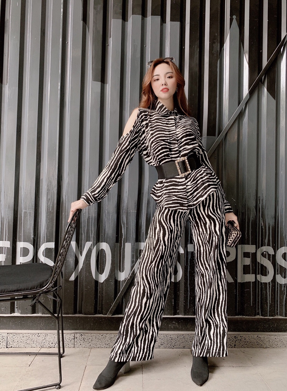 Set bộ quần ống suông áo sơ mi hoạ tiết kẻ ngang cao cấp (kèm thắt lưng)