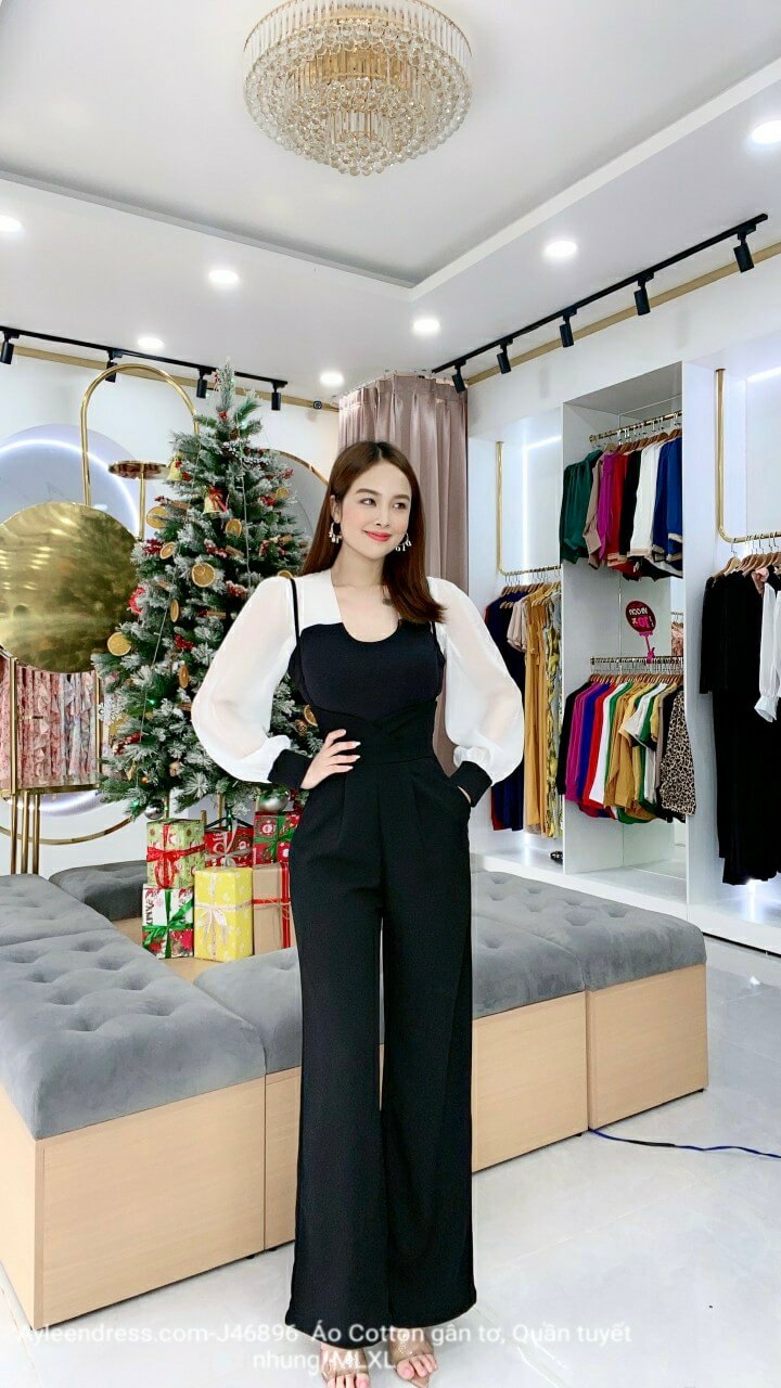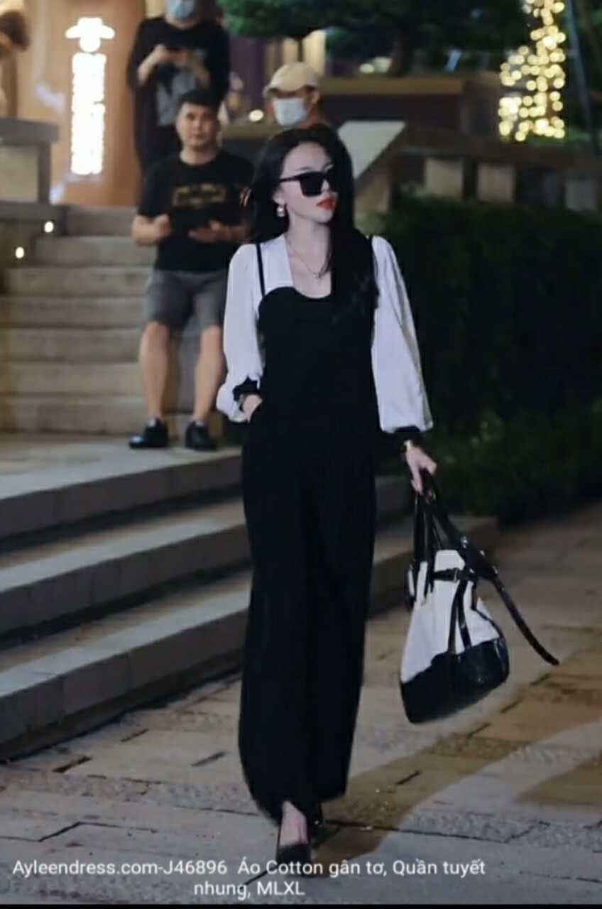 Set bộ quần yếm áo cổ U tay trắng sang trọng